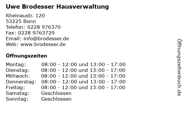 | Öffnungszeiten Uwe Brodesser Hausverwaltung in Bonn anzeigen | |