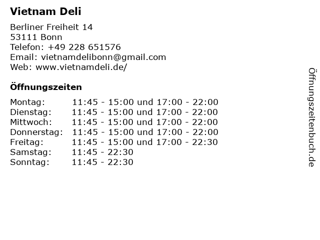| Öffnungszeiten Vietnam Deli in Bonn anzeigen | |