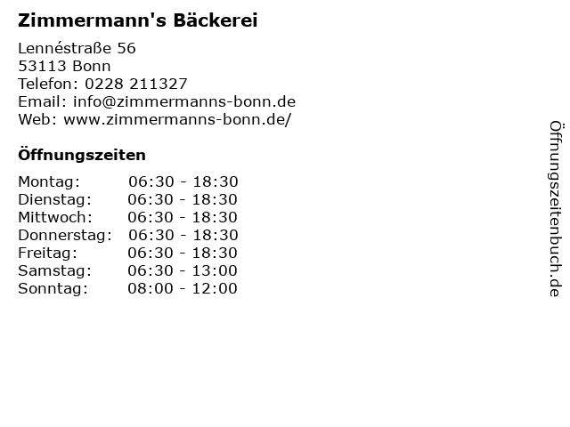 | Öffnungszeiten Zimmermann's Bäckerei in Bonn anzeigen | |