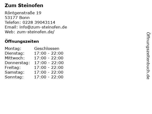 | Öffnungszeiten Zum Steinofen in Bonn anzeigen | |