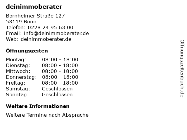 | Öffnungszeiten deinimmoberater in Bonn anzeigen | |
