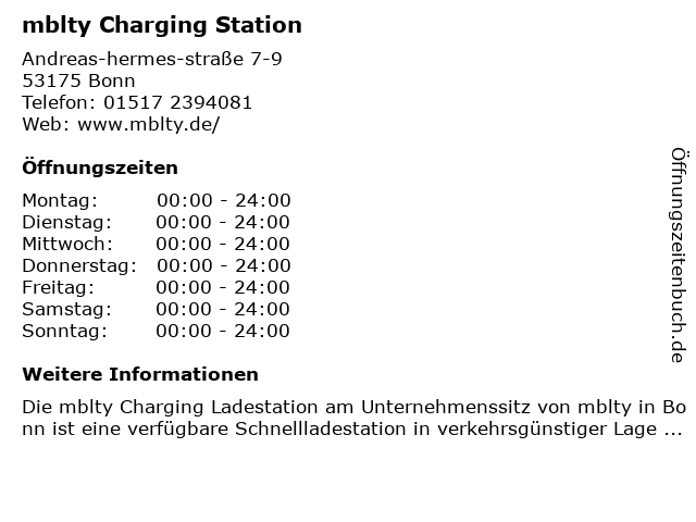 | Öffnungszeiten mblty Charging Station in Bonn anzeigen | |