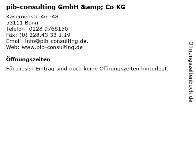 | Öffnungszeiten pib-consulting GmbH & Co KG in Bonn anzeigen | |