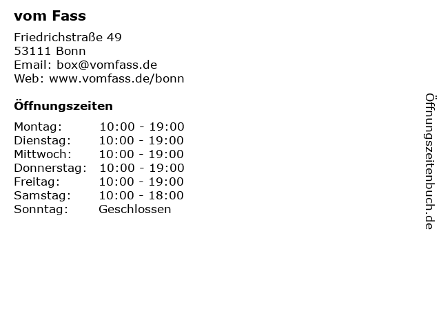 | Öffnungszeiten vom Fass in Bonn anzeigen | |