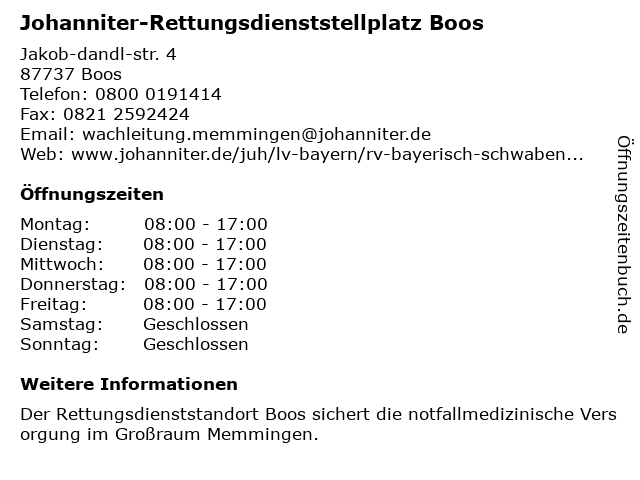 1 Johanniter-Rettungsdienststellplatz Babenhausen (Entfernung: 8,84 km) Am Espach 15, 87727 Babenhausen 2 5 RV Allgäu Johanniter-Unfall-Hilfe e.V. Hilfsorganisationen (Entfernung: 11,13 km) Altvaterstr. 8, 87700 Memmingen 6 Johanniter-Unfall-Hilfe - Dienststelle Regionalverband Allgäu (Entfernung: 11,14 km) Altvaterstr. 8, 87700 Memmingen |
