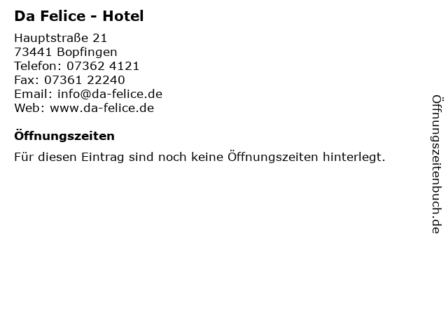 | Öffnungszeiten Da Felice - Hotel in Bopfingen anzeigen | |
