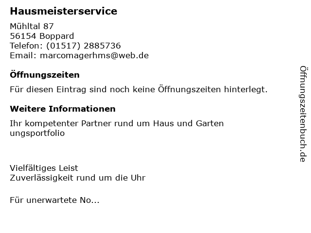 | Öffnungszeiten Hausmeisterservice in Boppard anzeigen | |