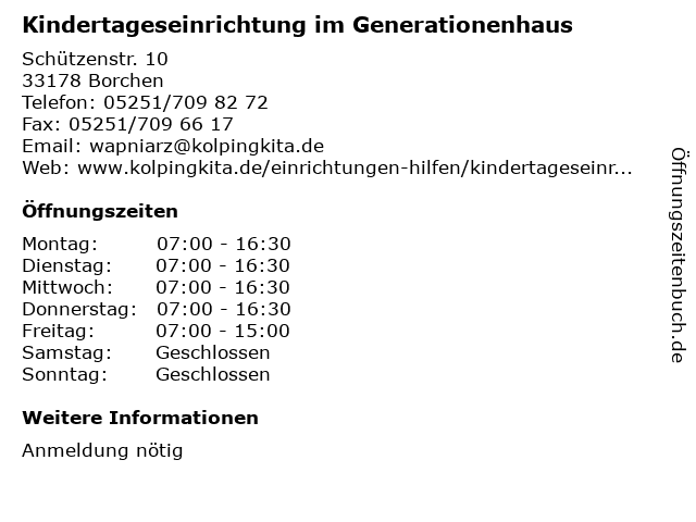 1 3 Katholische Kindertageseinrichtung St. Meinolfus (Entfernung: 5,30 km) Auf dem Bühl 20, 33178 Borchen 5 Katholische Kindertageseinrichtung St. Johannes Baptist (Entfernung: 8,22 km) Schützenstraße 12, 33154 Paderborn 6 Katholische Kindertageseinrichtung St. Meinolf (Entfernung: 8,29 km) Holsteiner Straße 20, 33142 Büren |