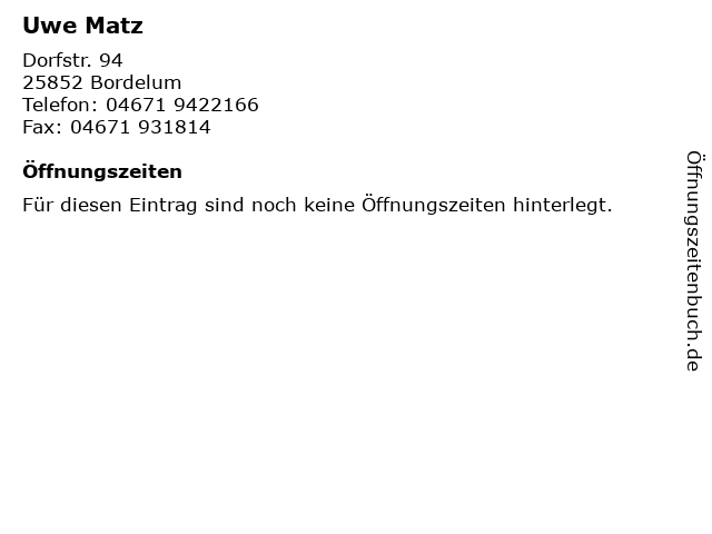 | Öffnungszeiten Uwe Matz in Bordelum anzeigen | |