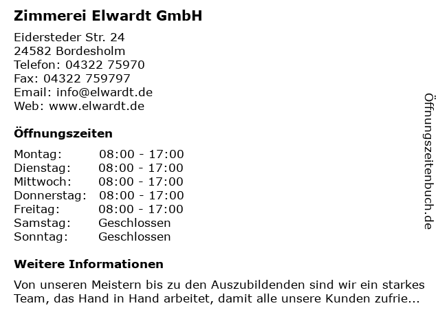 | Öffnungszeiten Zimmerei Elwardt GmbH in Bordesholm anzeigen | |