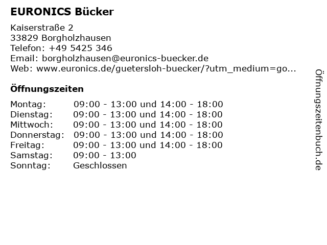 | Öffnungszeiten EURONICS Bücker in Borgholzhausen anzeigen | |