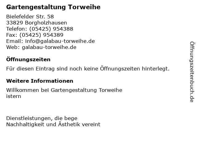 1 Garten- & Landschaftsbau Schmidt, Andreas Torweihe (Entfernung: 0,36 km) Barnhauser Str. 8, 33829 Borgholzhausen 5 Friedel Husemann Friedhofs- u. Gartengestaltung Bestattungen (Entfernung: 13,35 km) Berliner Straße 55, 33775 Versmold 6 |