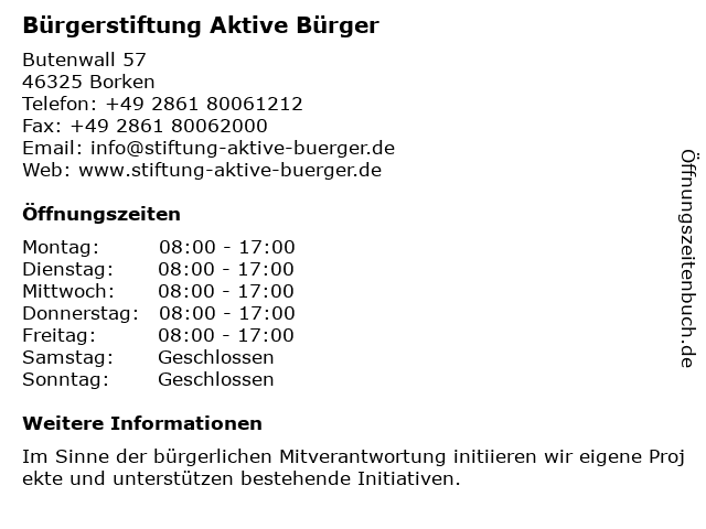 | Öffnungszeiten Bürgerstiftung Aktive Bürger in Borken anzeigen | |
