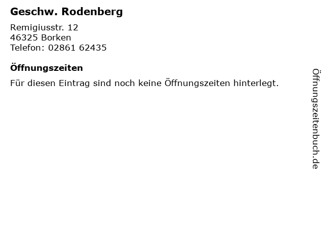 | Öffnungszeiten Geschw. Rodenberg in Borken anzeigen | |