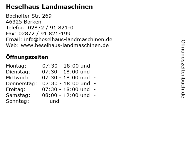 | Öffnungszeiten Heselhaus Landmaschinen in Borken anzeigen | |
