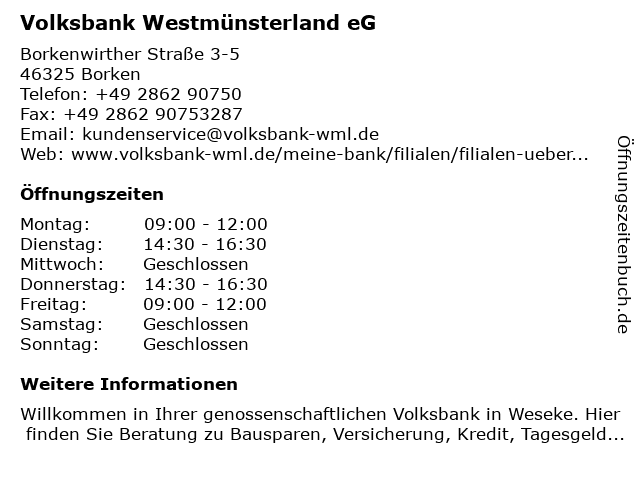 | Öffnungszeiten Volksbank Westmünsterland eG in Borken anzeigen | |