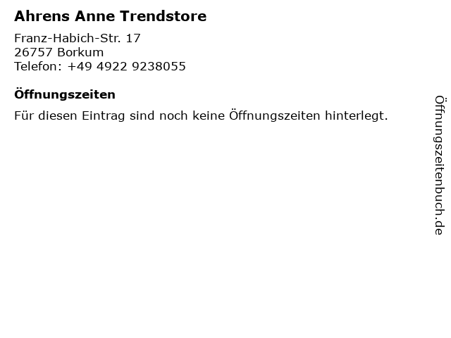 | Telefonnummer Ahrens Anne Trendstore in Borkum (+49 4922 9238055) anrufen | |
