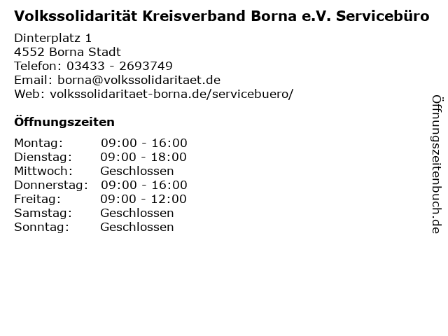 2 DRK Kreisverband Leipzig Land e.V. Schwangerschafts-, Familien-, Ehe- und Lebensberatung (Entfernung: 0,15 km) Roßmarktsche Straße 4, 04552 Borna 4 Debeka Versichern Bausparen Servicebüro Borna (Entfernung: 0,30 km) Wilhelm-Külz-Str. 22-24, 04552 Borna 5 Debeka Servicebüro Borna (Versicherungen und Bausparen) (Entfernung: 0,31 km) Wilhelm-Külz-Straße 22, 04552 Borna 6 Volkssolidarität Kreisverband Borna e.V. Geschäftsstelle (Entfernung: 0,81 km) Sachsenallee 2b, 04552 Borna Stadt |