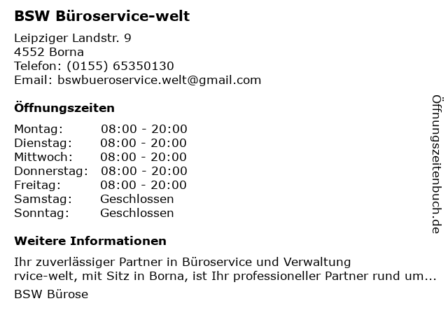 | Öffnungszeiten BSW Büroservice-welt in Borna anzeigen | |