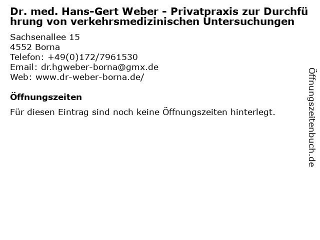 | Dr. med. Hans-Gert Weber - Privatpraxis zur Durchführung von verkehrsmedizinischen Untersuchungen anrufen | |
