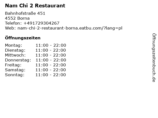 | Telefonnummer Nam Chi 2 Restaurant in Borna (+491729304267) anrufen | |