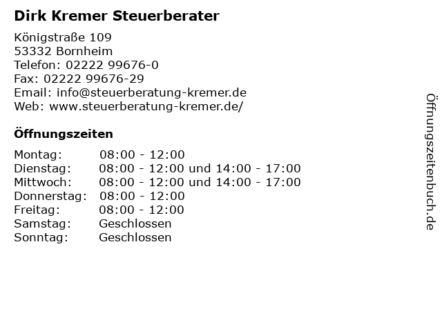 | Öffnungszeiten Dirk Kremer Steuerberater in Bornheim anzeigen | |