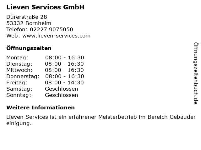 | Öffnungszeiten Lieven Services GmbH in Bornheim anzeigen | |