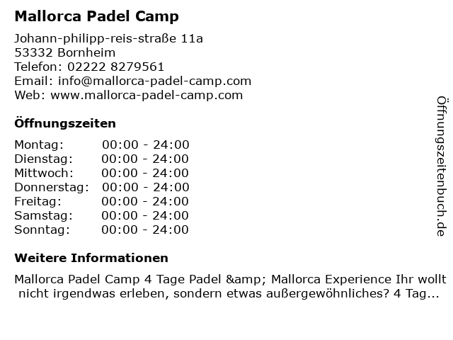 | Öffnungszeiten Mallorca Padel Camp in Bornheim anzeigen | |