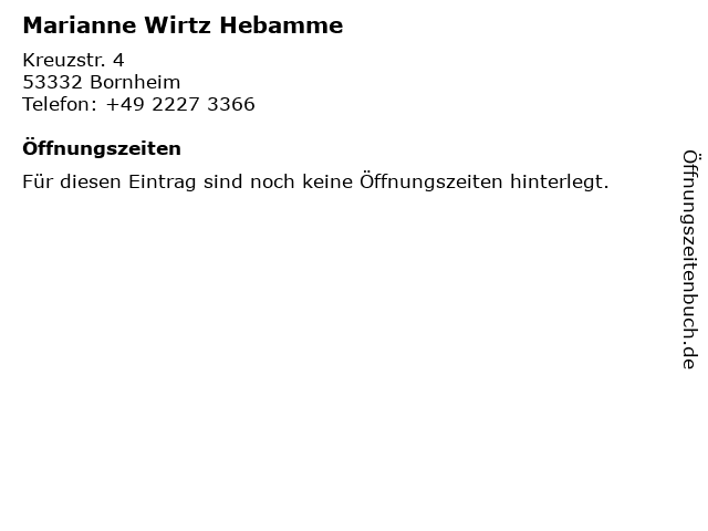 | Telefonnummer Marianne Wirtz Hebamme in Bornheim (+49 2227 3366) anrufen | |
