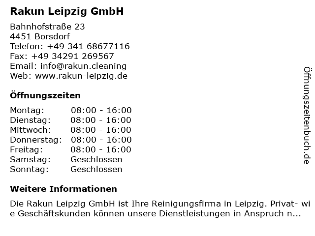 | Öffnungszeiten Rakun Leipzig GmbH in Borsdorf anzeigen | |