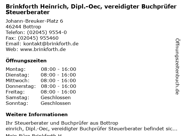 1 Brinkforth Heinrich, Dipl.-Oec, vereidigter Buchprüfer Steuerberater (Entfernung: 0,00 km) Johann-Breuker-Platz 6, 46244 Bottrop 3 Ingo Stoffel Steuerberater, vereidigter Buchprüfer, Rechtsbeistand (RAK) (Entfernung: 6,62 km) Clemens-August-Str. 60, 46282 Dorsten 5 Müller Ingolf Dipl.-Oec. Wirtschaftsprüfer u. Steuerberater Wirtschaftsprüfung (Entfernung: 9,80 km) Bogenstr. 40, 46236 Bottrop 6 Werner Klein vereidigter Buchprüfer und Steuerberater (Entfernung: 13,98 km) Wiedbach 11, 45357 Essen |