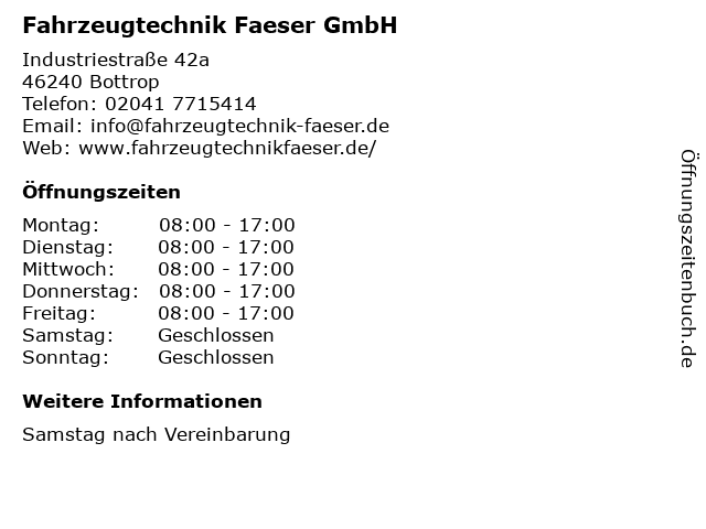 | Öffnungszeiten Fahrzeugtechnik Faeser GmbH in Bottrop anzeigen | |