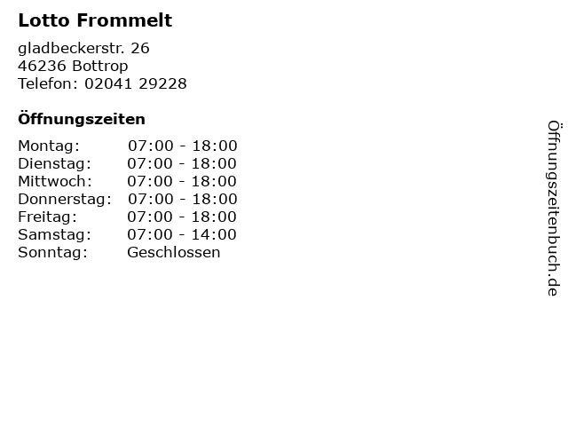 | Öffnungszeiten Lotto Frommelt in Bottrop anzeigen | |