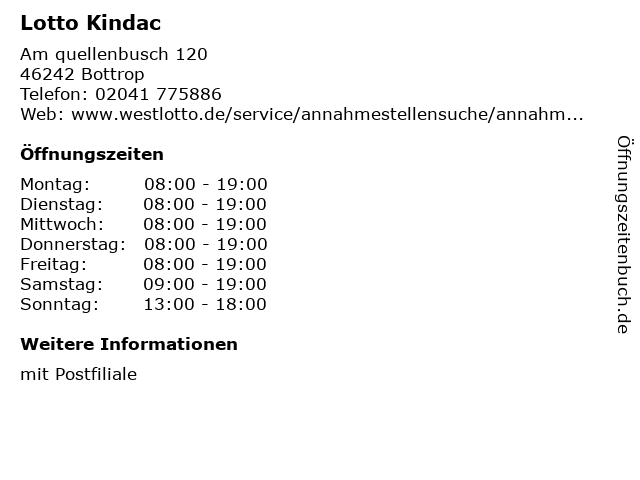 | Öffnungszeiten Lotto Kindac in Bottrop anzeigen | |
