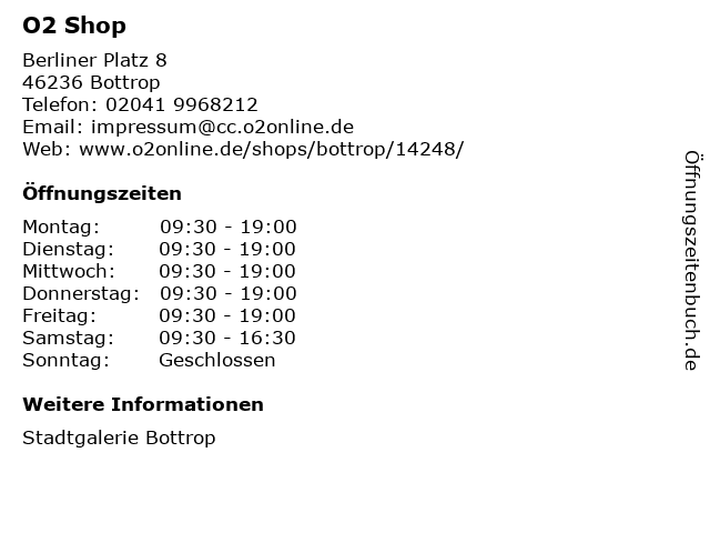 | Öffnungszeiten O2 Shop in Bottrop anzeigen | |