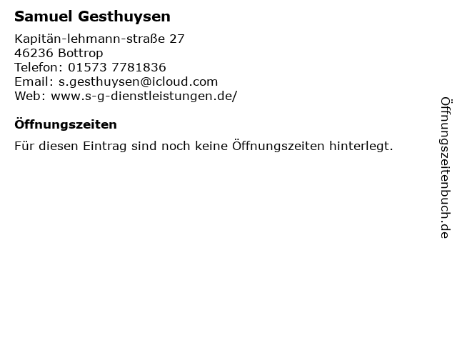 | Öffnungszeiten Samuel Gesthuysen in Bottrop anzeigen | |