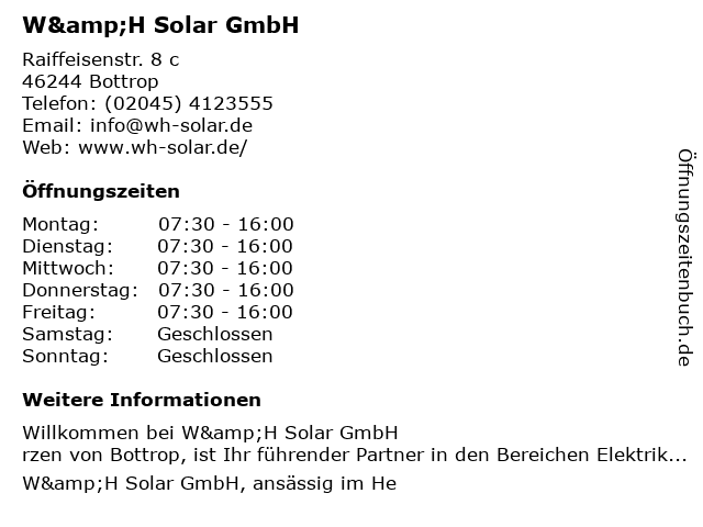 | Öffnungszeiten W&H Solar GmbH in Bottrop anzeigen | |