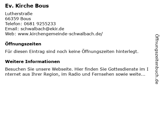 | Öffnungszeiten Ev. Kirche Bous in Bous anzeigen | |