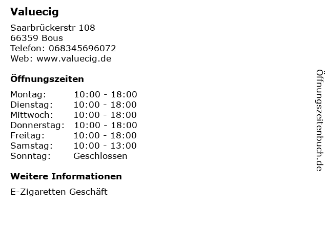 | Öffnungszeiten Valuecig in Bous anzeigen | |