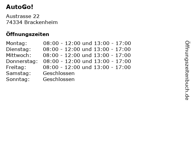Öffnungszeiten AutoGo! in Brackenheim anzeigen | |