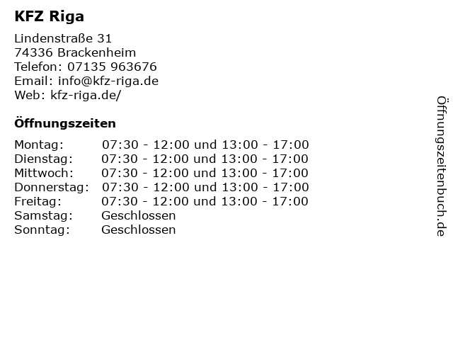 | Öffnungszeiten KFZ Riga in Brackenheim anzeigen | |