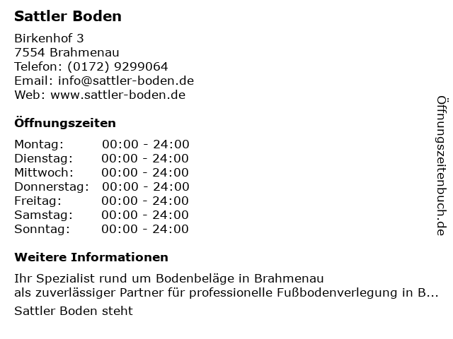 | Öffnungszeiten Sattler Boden in Brahmenau anzeigen | |