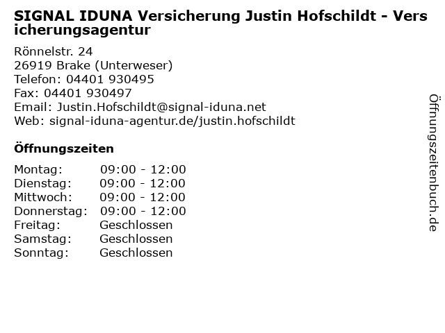 1 SIGNAL IDUNA Versicherung Tassilo Scheffran - Versicherungsagentur (Entfernung: 0,00 km) Rönnelstr. 24, 26919 Brake (Unterweser) 2 SIGNAL IDUNA - Generalagentur Andreas & Petra Hofschildt (Entfernung: 0,00 km) Rönnelstr. 24, 26919 Brake 3 SIGNAL IDUNA Versicherung Miklas Kunst - Versicherungsagentur (Entfernung: 0,01 km) Rönnelstr. 24, 26919 Brake (Unterweser) 6 |