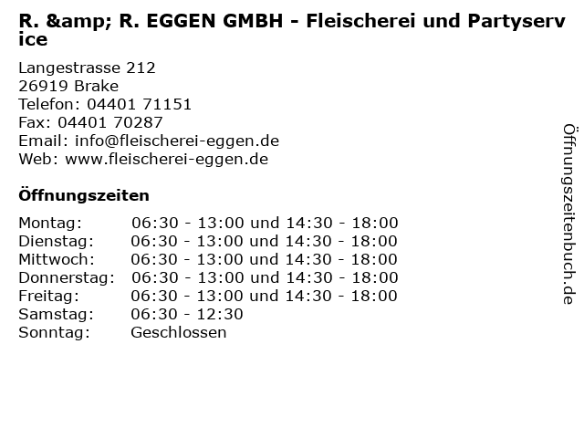 1 Eggen GmbH, R. u. R. Fleischerfachgeschäft und Partyservice (Entfernung: 0,00 km) Lange Str. 212, 26919 Brake 6 |