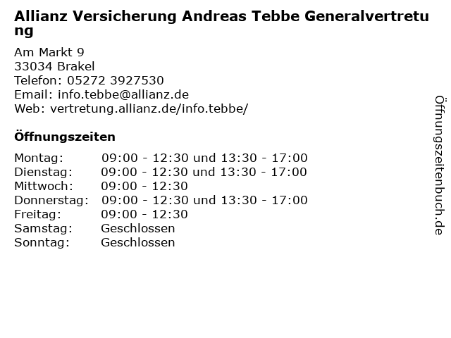 3 Mecklenburgische Versicherungsgruppe - Generalvertretung Hans-Werner Körber (Entfernung: 0,33 km) Warburger Str. 1, 33034 Brakel 4 Allianz Versicherung Hegemann OHG Generalvertretung (Entfernung: 11,24 km) Konrad-adenauer-ring 7, 33014 Bad Driburg 5 AXA Generalvertretung Franz Streitbürger (Entfernung: 11,62 km) Prälat-Zimmermann-Straße 7, 33014 Bad Driburg 6 Mecklenburgische Versicherungsgruppe - Generalvertretung Günter Fricke (Entfernung: 14,80 km) Westerbachstr. 25, 37671 Höxter |