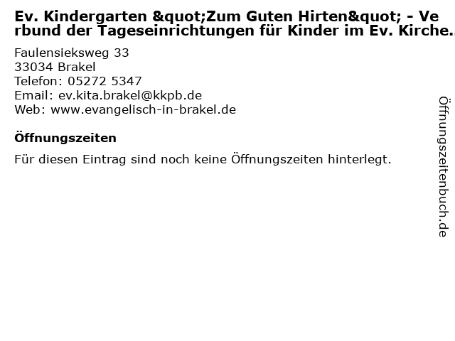 | Ev. Kindergarten "Zum Guten Hirten" - Verbund der Tageseinrichtungen für Kinder im Ev. Kirchenkreis Paderborn anrufen | |