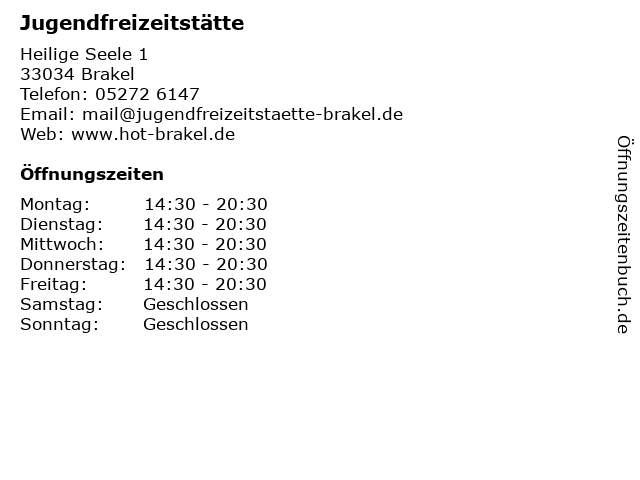 | Öffnungszeiten Jugendfreizeitstätte in Brakel anzeigen | |