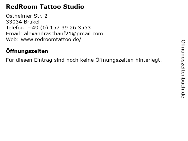 | Öffnungszeiten RedRoom Tattoo Studio in Brakel anzeigen | |