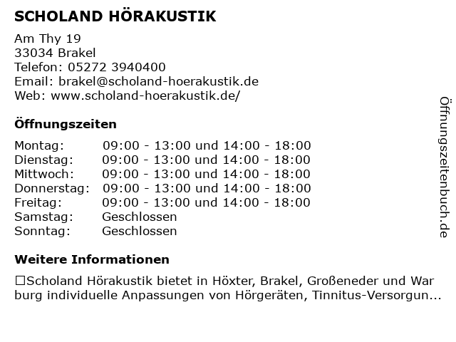 | Öffnungszeiten SCHOLAND HÖRAKUSTIK in Brakel anzeigen | |