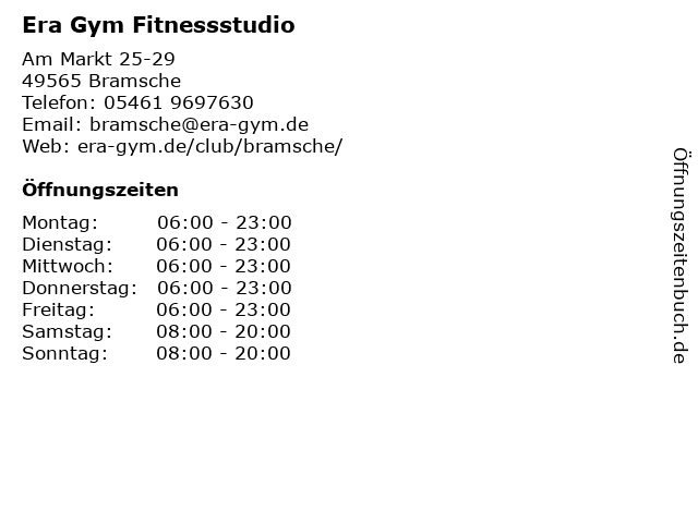 | Öffnungszeiten Era Gym Fitnessstudio in Bramsche anzeigen | |